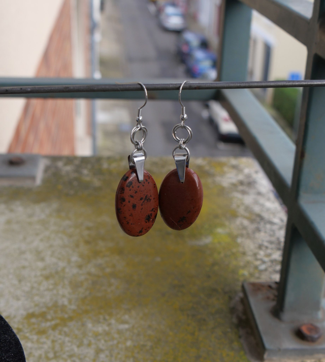 Boucles d'oreille en acier inoxydable et jaspes acajou