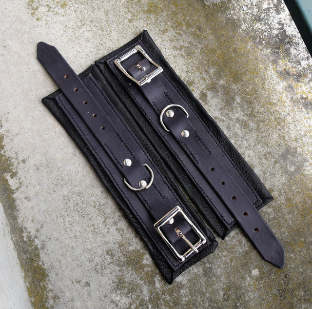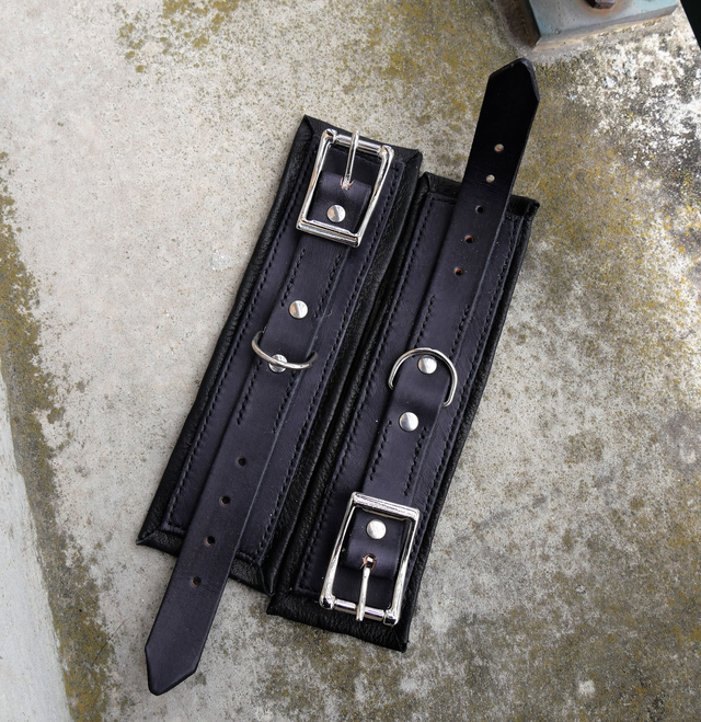 Paire de Bracelets en cuir teinté et cousu à la main. Doublés de cuir doux de cerf