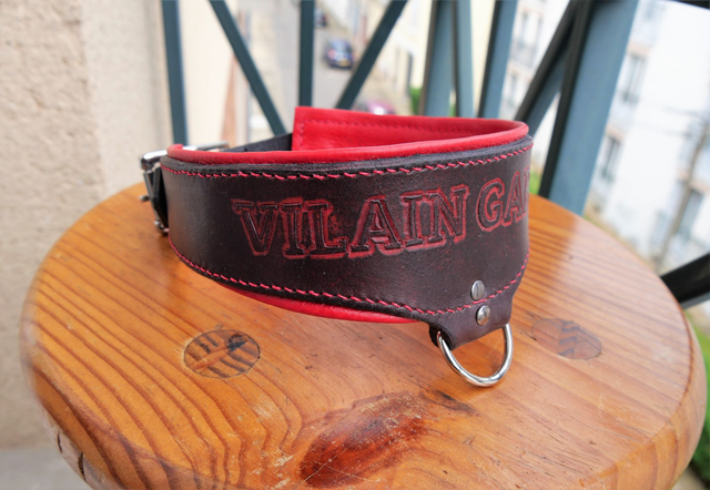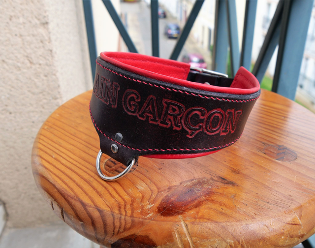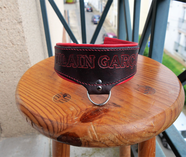 Collier en cuir gravé, teinté et cousu à la main. Doublé d'un cuir de chèvre