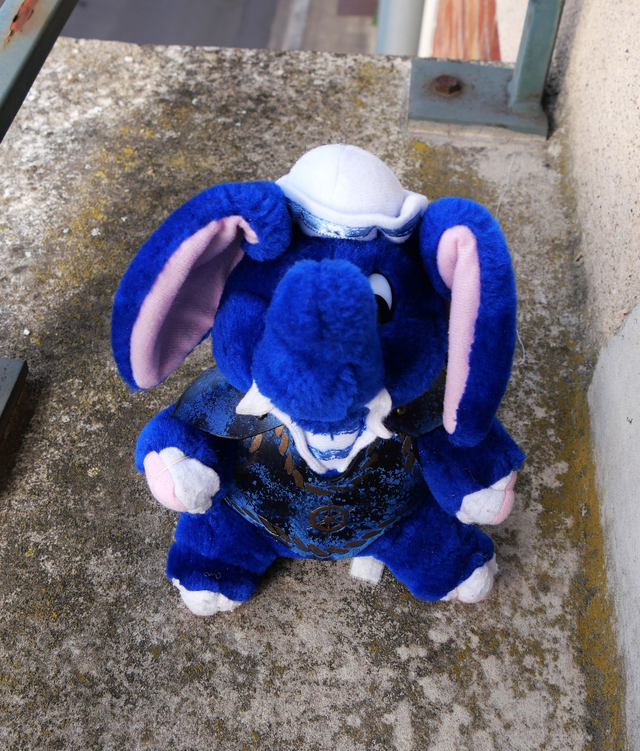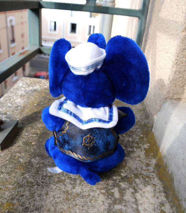 Peluche de seconde main avec une armure enlevable en cuir tannage végétal gravé, teinté et cousu à la main