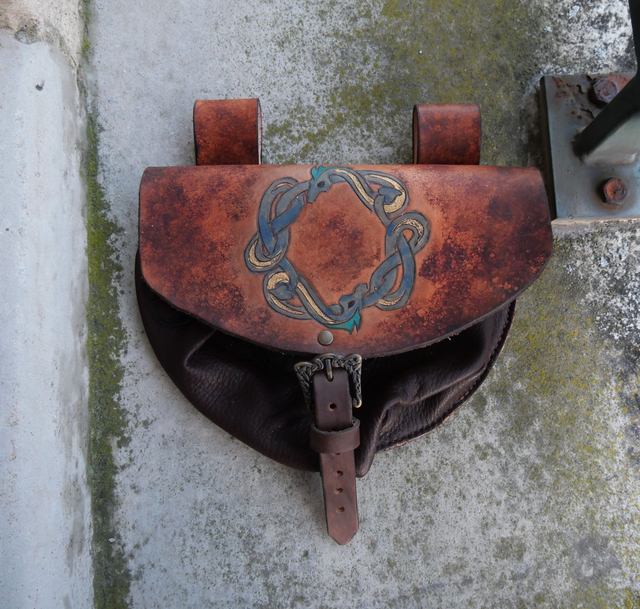Grande escarcelle avec passant pour la ceinture gravé, cousu et teinté à la main