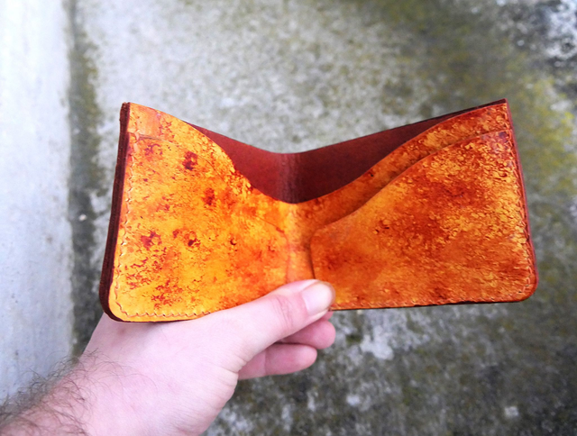 Porte carte gravé, teinté et cousu a la main en cuir tannage végétal