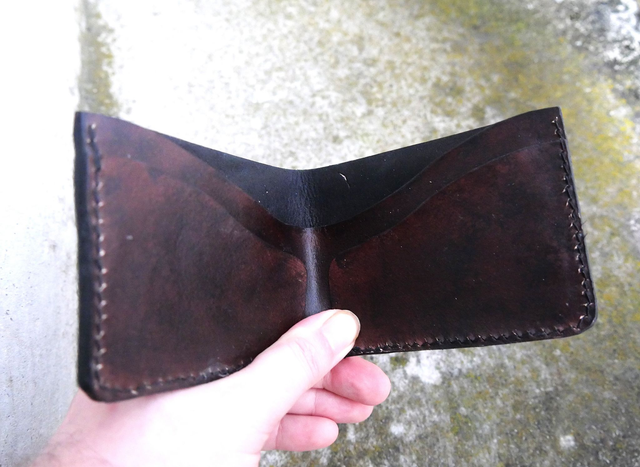 Porte carte gravé, teinté et cousu a la main en cuir tannage végétal