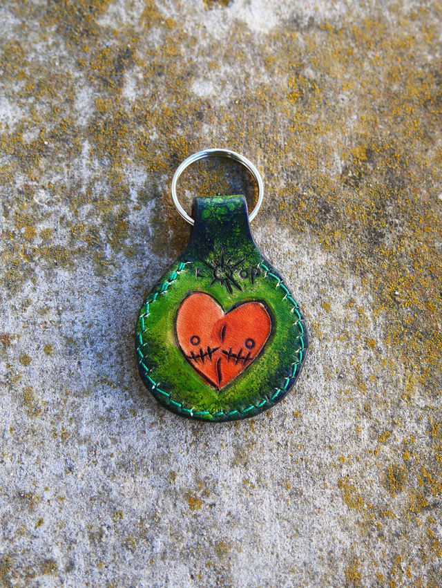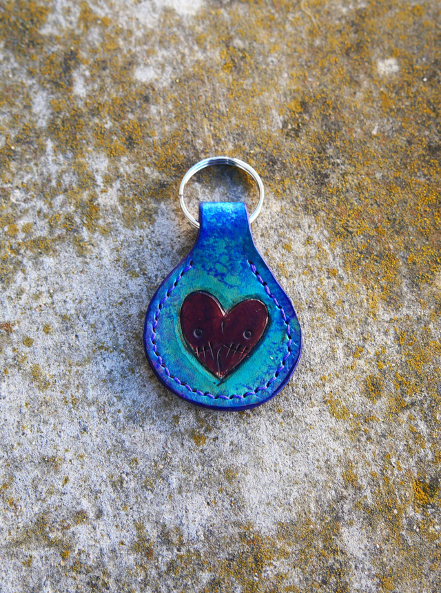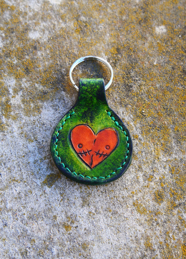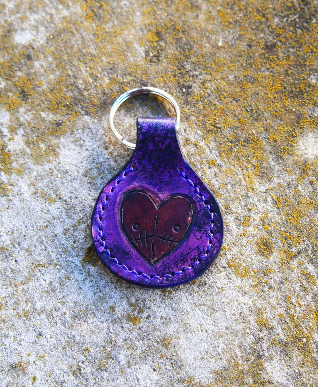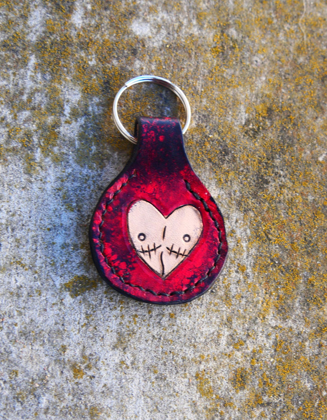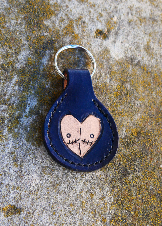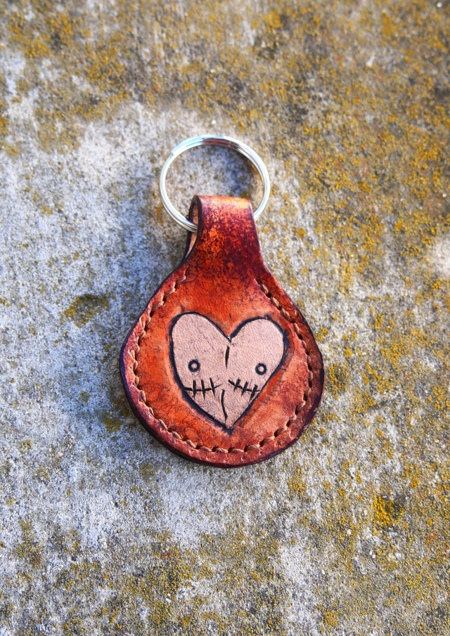 Porte clé gravé, teinté et cousu à la main. Le dessin est de Loop et 30% du prix lui sera reversé.