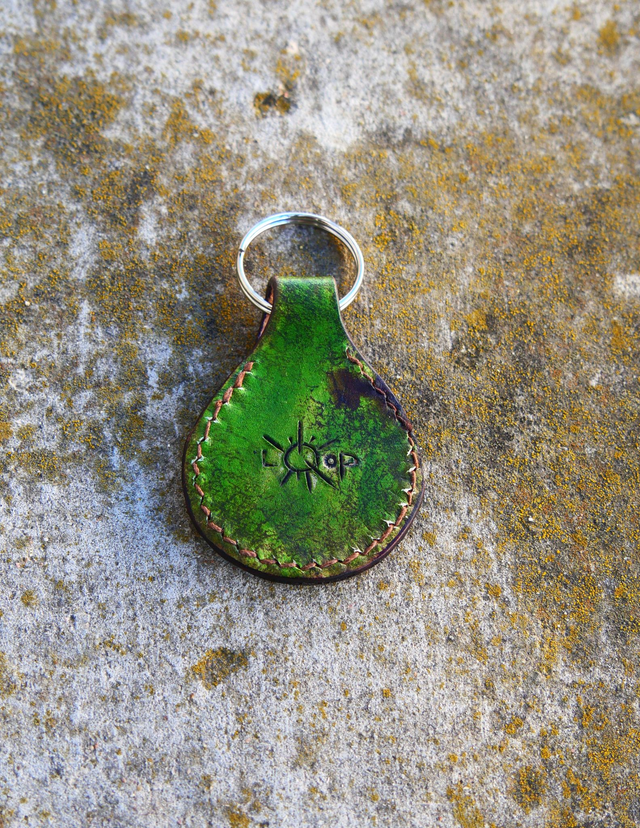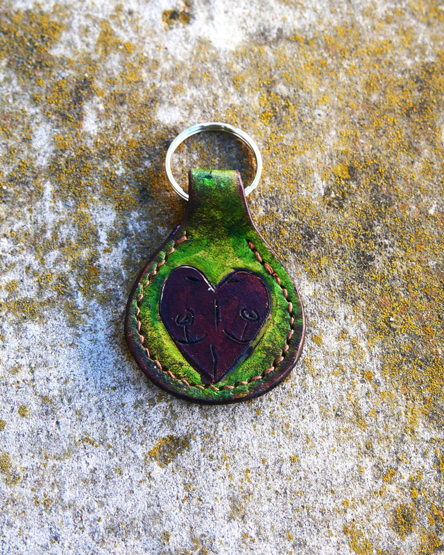 Porte clé gravé, teinté et cousu à la main. Le dessin est de Loop et 30% du prix lui sera reversé.