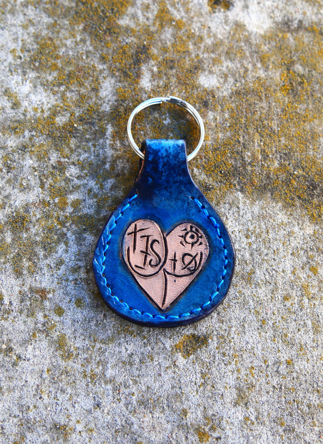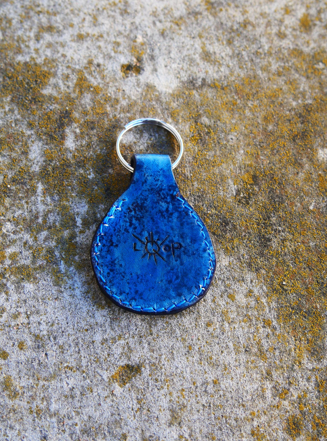 Porte clé gravé, teinté et cousu à la main. Le dessin est de Loop et 30% du prix lui sera reversé.
