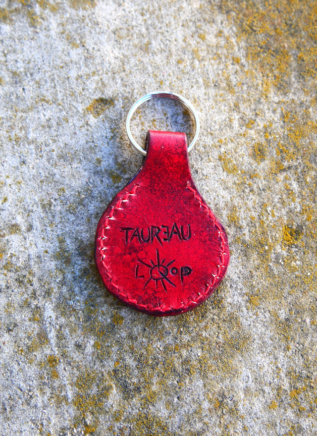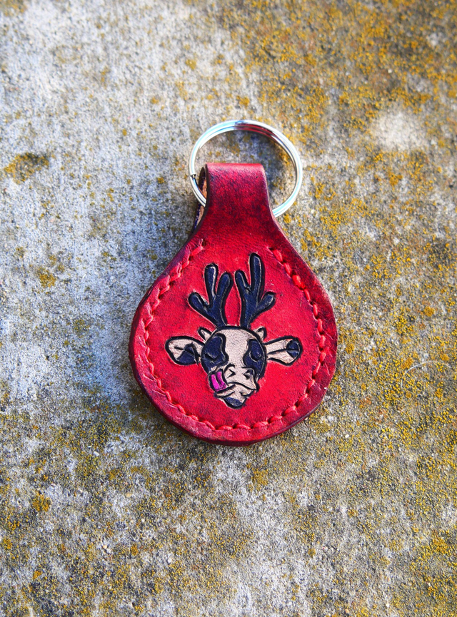 Porte clé gravé, teinté et cousu à la main. Le dessin est de Loop et 30% du prix lui sera reversé.